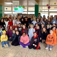 Unsere Schülerinnen und Schüler zeigten an Halloween ihre fantasievollen Kostüme und sorgten damit für eine fröhliche Atmosphäre im Schulhaus. Die Schülervertretung hat diesen besonderen Anlass in einem Foto festgehalten.