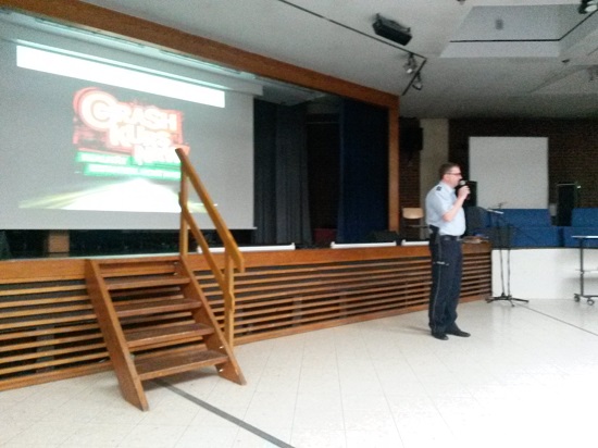 „Jedes Jahr sterben 100 junge Menschen in Nordrhein-Westfalen im Straßenverkehr“, begann Markus Tewes von der Polizei, „und 450 wurden teilweise so schwer verletzt, dass sich ihr ganzes weiteres Leben für immer verändert hat“. Der erfahrene Polizeibeamte betonte, dass vor allem junge Fahrerinnen und Fahrer an schweren Verkehrsunfällen vertreten sind. Deshalb führt man seit 2011 das Projekt „Crash Kurs NRW“ an Schulen durch, um die Zahl von Verkehrsunfällen - vor allem solche mit jugendlichen Beteiligten- nachhaltig und landesweit zu senken.