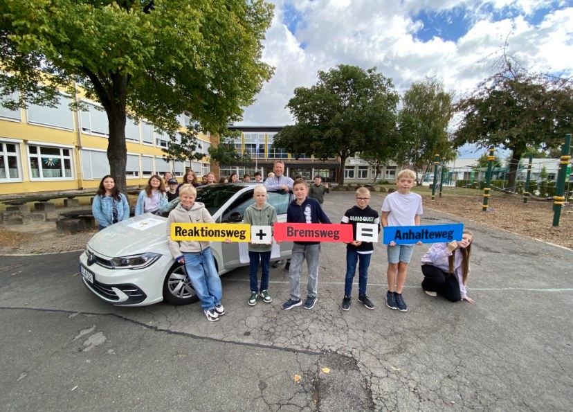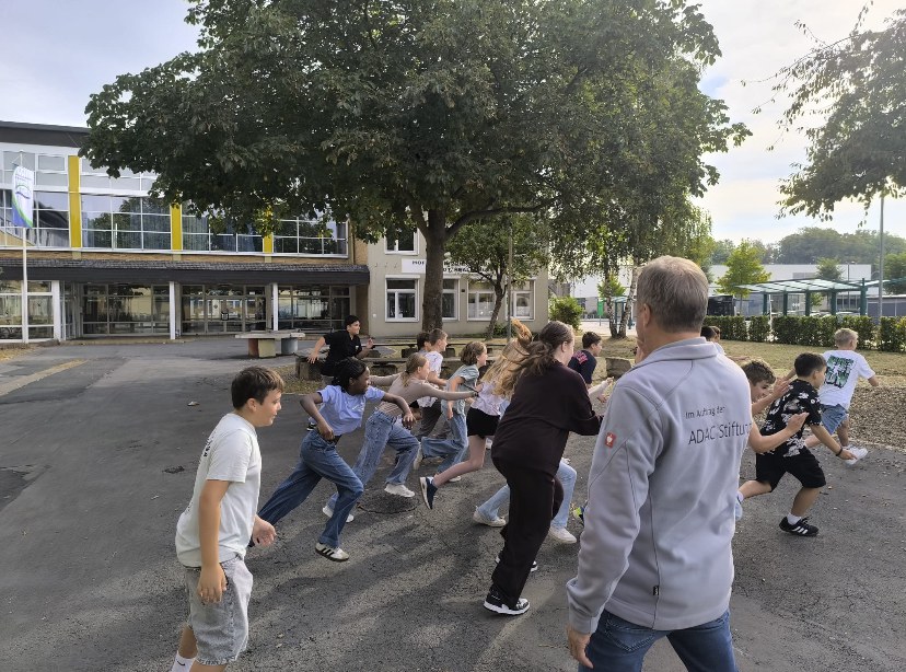 Die Kinder erarbeiteten aktiv die Zusammenhänge zwischen Geschwindigkeit, Reaktionsweg, Bremsweg, Fahrbahnbeschaffenheit und dem daraus folgenden Anhalteweg. Dabei schlüpften sie sowohl in die Rolle des Fußgängers als auch des Mitfahrers im Auto. Bei einer Vollbremsung lernten die Schülerinnen und Schüler die Bedeutung des Anschnallgurtes kennen und erfuhren die Folgen der Ablenkung durch Smartphone und Kopfhörer. Ein herzliches Dankeschön geht an den Moderator vom ADAC Herrn Lehmann, der diese Veranstaltung für unsere Schüler/ innen anschaulich und einprägsam durchgeführt hat.
