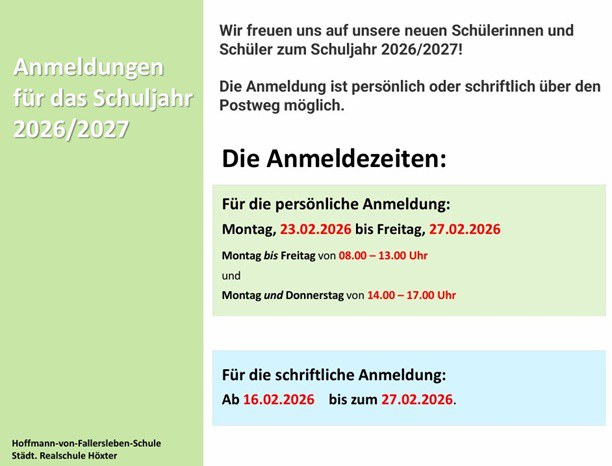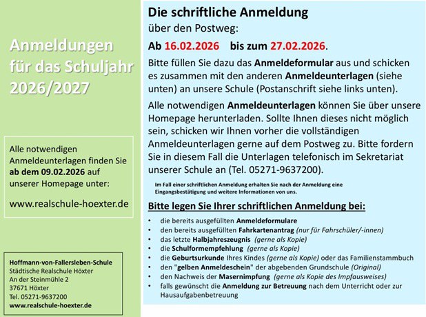 Wenn Sie Ihr Kind an der Realschule Höxter für die 5. Klasse des Schuljahres 2026/2027 anmelden möchten, erhalten Sie hier alle wichtigen Informationen rund um das Anmeldeverfahren.